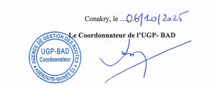 Home / AGEROUTE GUINEE-SA / UGP-BAD: AVIS À MANIFESTATION D’INTÉRÊT N°017C/MITP/AGEROUTE/UGP-BAD/2025 SELECTION D’UN CONSULTANT POUR LES SERVICES D’AUDIT COMPTABLE ET FINANCIER DES EXERCICES 2025, 2026 ET L’AUDIT DE CLOTURE DU PROJET DE RECONSTRUCTION DE LA ROUTE COYAH-FARMOREAH-FRONTIERE SIERRA LEONE / SIGNATURE UGP-BAD AMI Audit Comptable Coyah