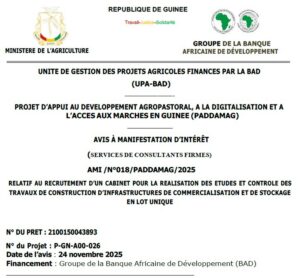 Le Gouvernement de la République de Guinée a sollicité et obtenu un financement du Fonds Africain de Développement (FAD/BAD) sous forme de prêt pour financer en partie le Projet d’Appui au Développement agropastoral, à la Digitalisation et à l’Accès aux Marchés en Guinée (PADDAMAG).