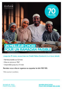 UN MEILLEUR CHOIX POUR UN RAMADAN PAISIBLE Jusqu’au 31 mars, souscrivez au Crédit Relax Ecobank à un taux réduit. Share Facebook Twitter Google + Stumbleupon LinkedIn Pinterest